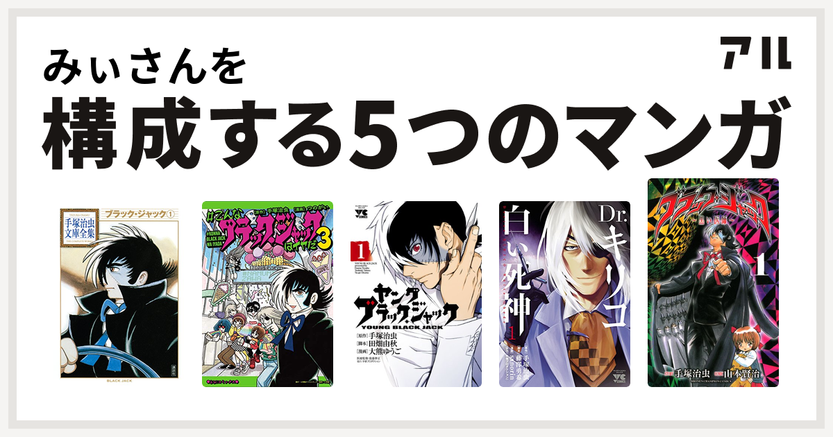 みぃさんを構成するマンガはブラック ジャック こんなブラック ジャックはイヤだ ヤング ブラック ジャック Dr キリコ 白い死神 ブラック ジャック 黒い医師 私を構成する5つのマンガ アル